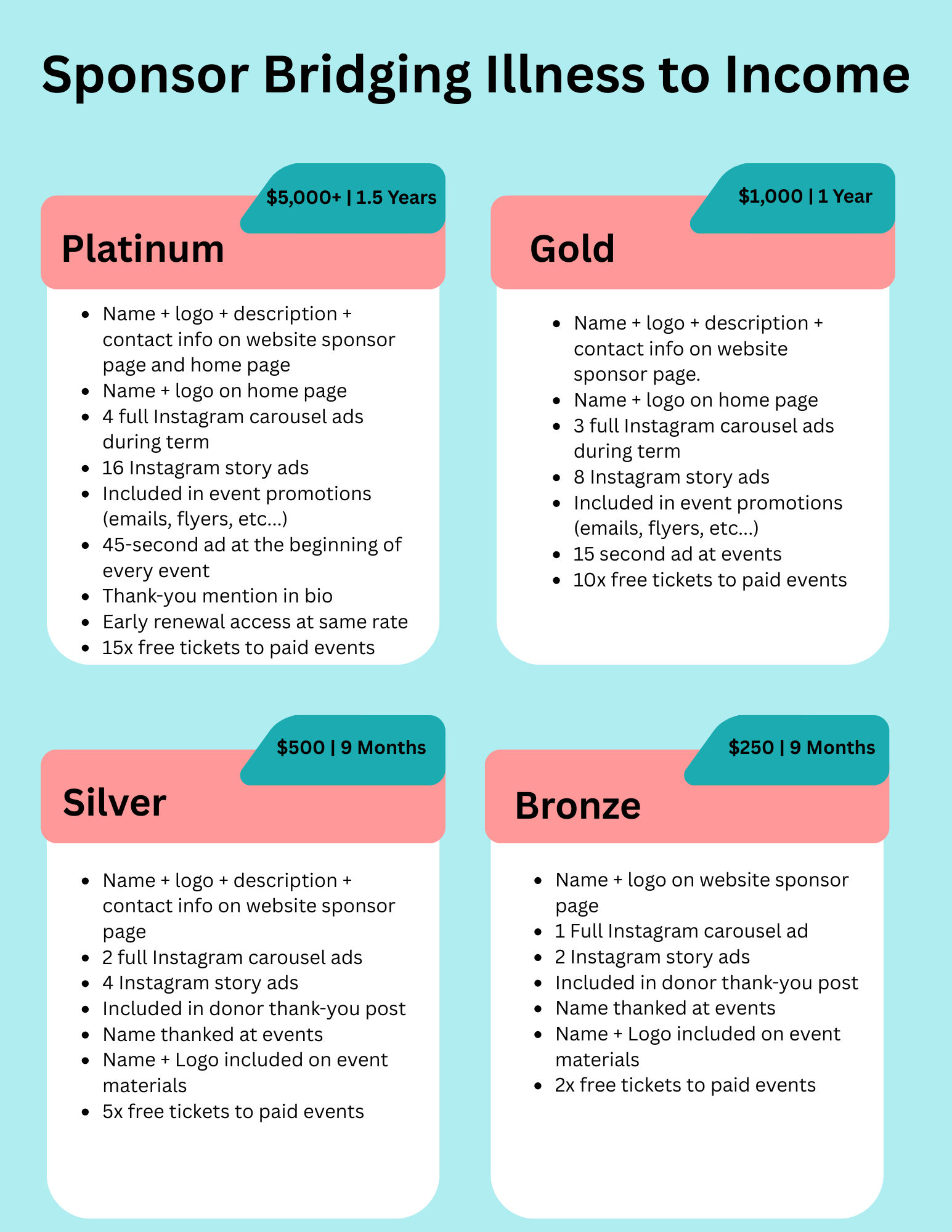 Sponsoring Bridging Illness to Income allows your business to directly support individuals with chronic illness while gaining visibility through our website, social media, and events.